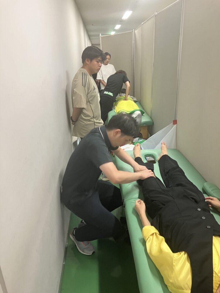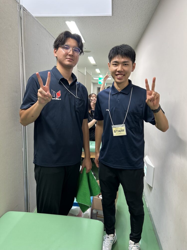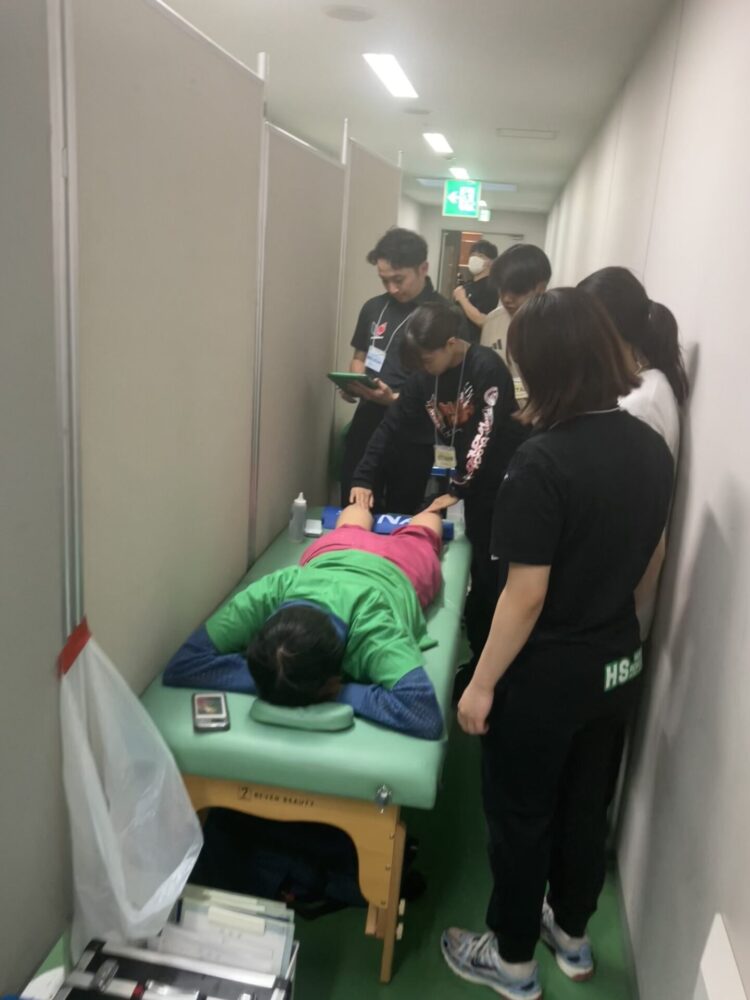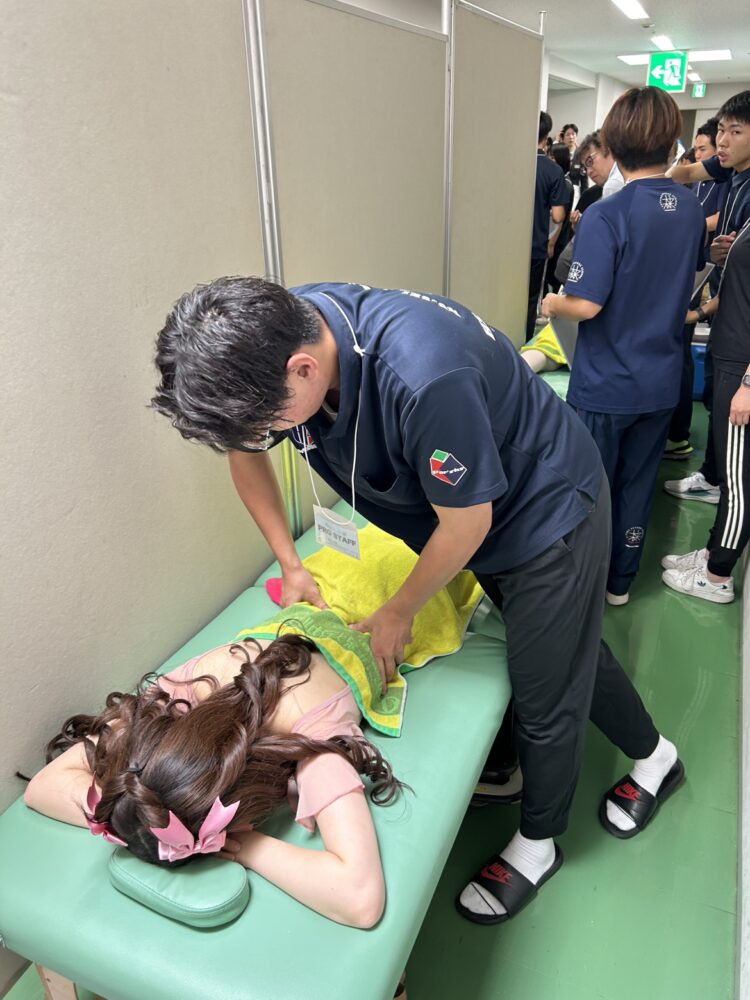 2日間で計78名もの利用があり、学生たちはストレッチ、テーピング、マッサージ、アイシングなどトレーナーに必要な技術を見学、実践することができました。今回の経験を通して、学んだこと、できなかったこと、もっとこうしたかったという反省など、全てを成長の糧にして、トレーナーとして大きく羽ばたけるよう願っています。