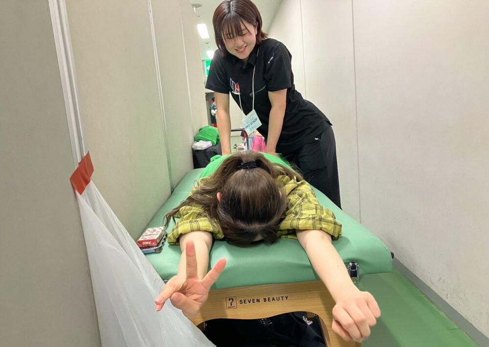 このトレーナーブースは、都内を中心にはりきゅう整骨院を展開する「HSコーポレーション」の指導のもと運営。学生にとってプロのトレーナー技術を学ぶ貴重な機会となりました。また、ミュージカルのサポートというスポーツ現場のトレーナー活動とは異なるシチュエーションで、非常に良い刺激を受けることができました。