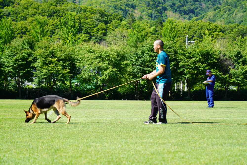 試験内容は「足跡追及」と「臭気選別」の2科目。「足跡追及」は人が歩いた印跡を追従する作業で、犯人の逃走経路や行方不明者の捜索に役立ちます。審査会では約100歩のコースを正確に追及できるかが求められます。一方、「臭気選別」は、現場の遺留品などが容疑者の匂いと一致するかを犬に判別させる作業です。審査では「容疑者」の臭いが付着した布片を犬に嗅がせ、同じ匂いを付けた布片を4回の試行で3回正しく選び取ることが求められます。
