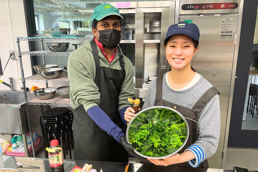 校内の圃場で育てたニンジン、ホウレンソウ、ピーマンなど5種類以上の彩り野菜を使用。ご飯との配分やコチュジャンダレの配合比率は、延べ10回以上の試作を重ねて決定しました。仕上げに混ぜるナムルは、茹で時間や味付けの塩分濃度を測定し、食感と風味のバランスをこだわりぬいて調整。試食した教職員からは「毎日でも食べたい」という声が上がりました。