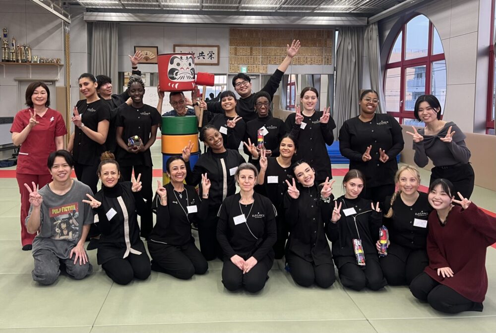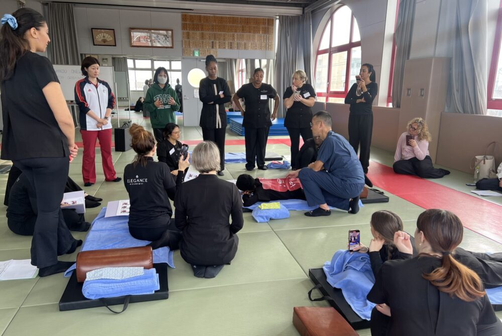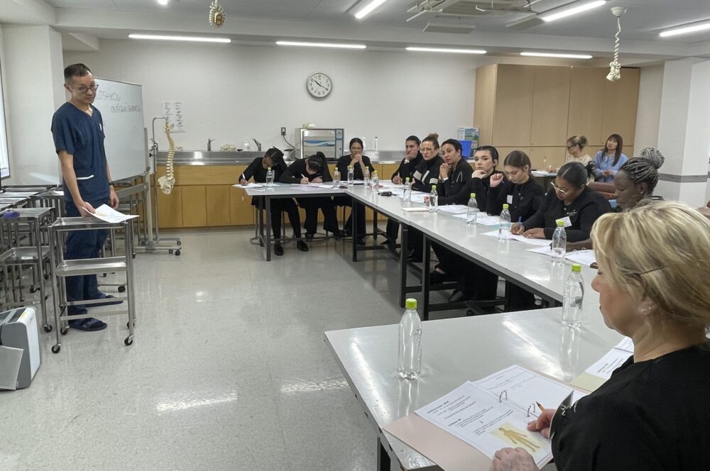 2月23日・24日の2日間、フランス南東部の世界的リゾート都市・ニースにあり、エステとスパの分野でプロフェッショナルを養成する「エレガンスアカデミー」の学生の皆さんが、日本研修旅行の一環として東京メディカル・スポーツ専門学校を訪れ、東洋医学研修を受講しました。研修は株式会社スーパーモードの主催で行われ、フェイシャルエステを中心に学ぶ学生から全身エステを学ぶ学生まで、幅広い年代の学生14名と引率教員1名が参加しました。